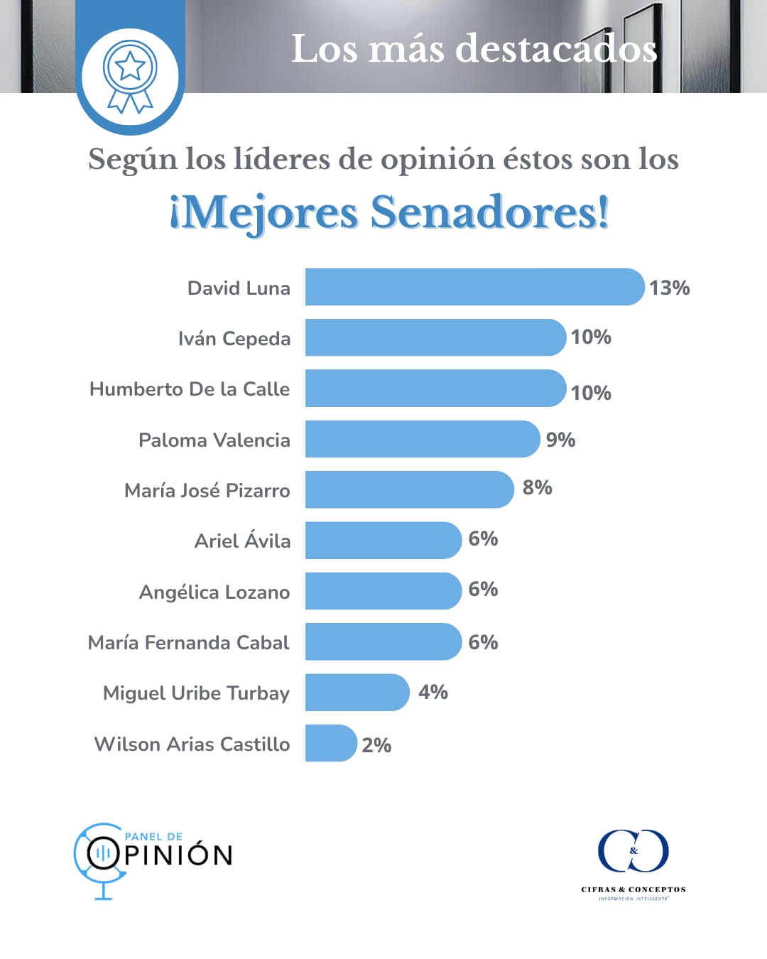 En el caso del Senado, David Luna lidera con un 13% de conceptos favorables. Hace un año figuraba en cuarto lugar con un 9%. En segundo puesto aparece Iván Cepeda, que repite tanto la posición como el resultado, con un 10%.