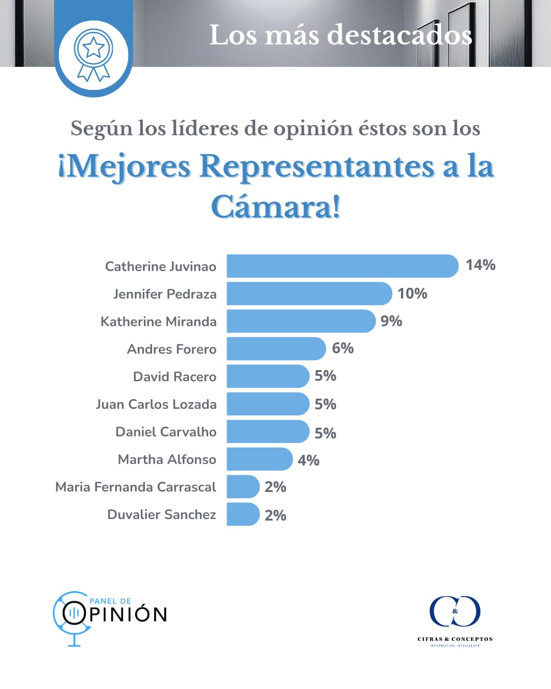 El top 3 de la Cámara está liderado por mujeres. Catherine Juvinao se mantuvo en el primer lugar, obteniendo un 14%, lo que representa un aumento de dos puntos porcentuales respecto a 2023. En segundo puesto aparece Jennifer Pedraza, con un 10%, que subió tres escaños. Katherine Miranda es la tercera, con un 9%, manteniéndose en la misma posición. La tolimense destacada fue Martha Alfonso, en el puesto 8.