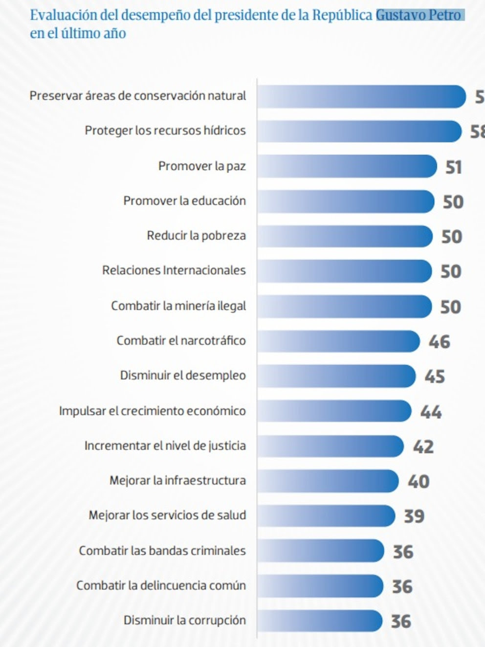 Según el informe, Gustavo Petro se destaca en temas ambientales, lo que refleja su enfoque en la sostenibilidad y el cambio climático. Sin embargo, su calificación en seguridad es preocupante, siendo el peor evaluado en este aspecto.