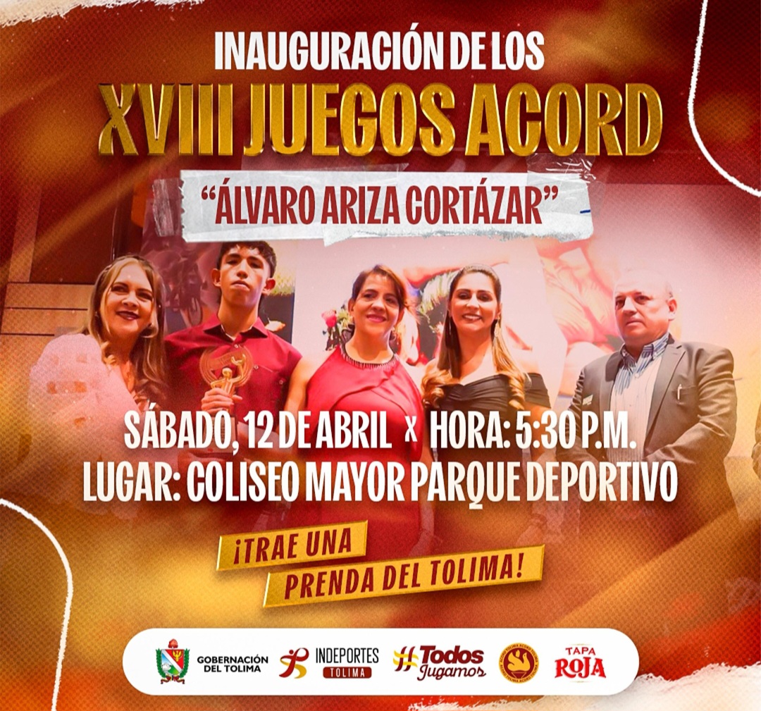 Los Juegos Acord XVIII “Álvaro Ariza Cortázar” reunirán a más de 600 periodistas deportivos de todo el país del 12 al 19 de abril en Ibagué-Tolima y contarán con el apoyo de la gobernación a través de Indeportes Tolima.