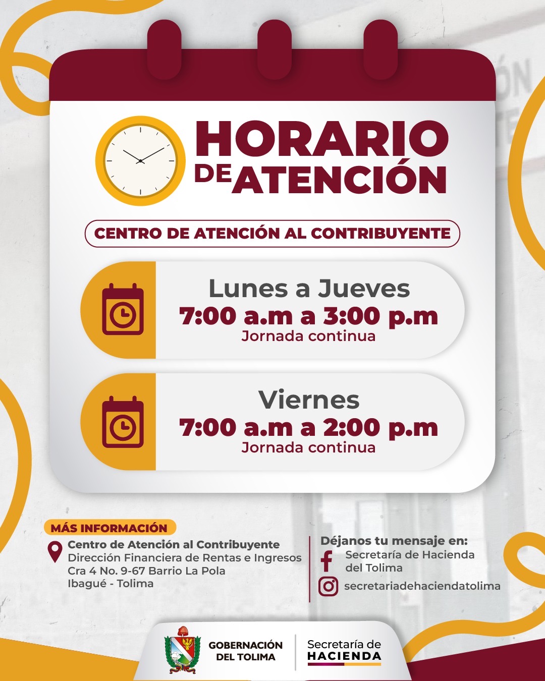 📩 Para resolver inquietudes o solicitar información, los ciudadanos pueden dejar su mensaje a través de las redes sociales oficiales de la Secretaría de Hacienda del Tolima, donde serán atendidos oportunamente.