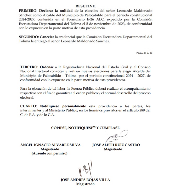 En una sorpresiva decisión que ha sacudido la política local en el municipio de Palocabildo, el Tribunal Administrativo del Tolima ha anulado la elección del actual alcalde Leonardo Maldonado.